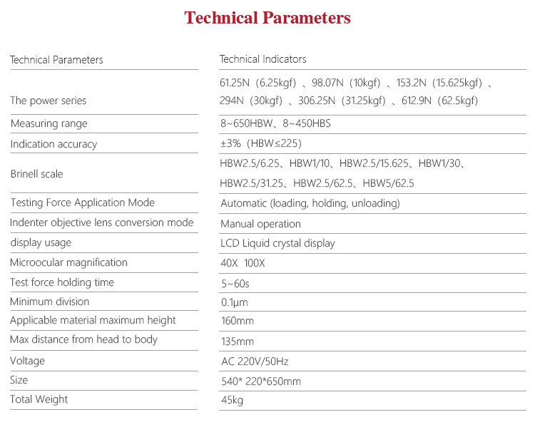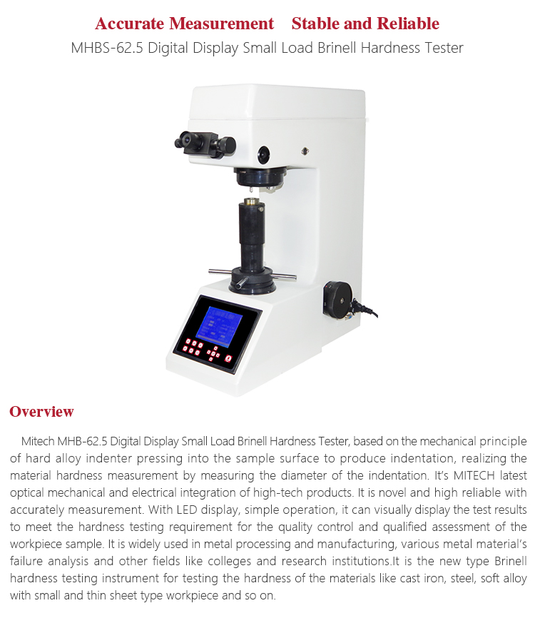 Mitech MHB-62.5 Digital Display Small Load Brinell Hardness Tester, based on the mechanical principle of hard alloy indenter pressing into the sample surface to produce indentation, realizing the material hardness measurement by measuring the diameter of the indentation. It’s MITECH latest optical mechanical and electrical integration of high-tech products. It is novel and high reliable with accurately measurement. With LED display, simple operation, it can visually display the test results to meet the hardness testing requirement for the quality control and qualified assessment of the workpiece sample. It is widely used in metal processing and manufacturing, various metal material’s failure analysis and other fields like colleges and research institutions.It is the new type Brinell hardness testing instrument for testing the hardness of the materials like cast iron, steel, soft alloy with small and thin sheet type workpiece and so on.