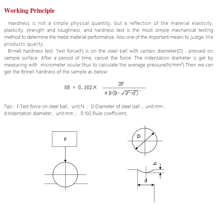 Brinell hardness test: Test force(F) is on the steel ball with certain diameter(D) , pressed on sample surface. After a period of time, cancel the force. The indentation diameter is get by measuring with  micrometer ocular,thus to calculate the average pressure(N/mm2).