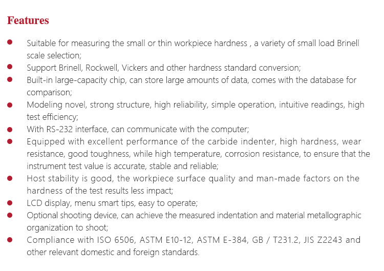 Compliance with ISO 6506, ASTM E10-12, ASTM E-384, GB / T231.2, JIS Z2243 and other relevant domestic and foreign