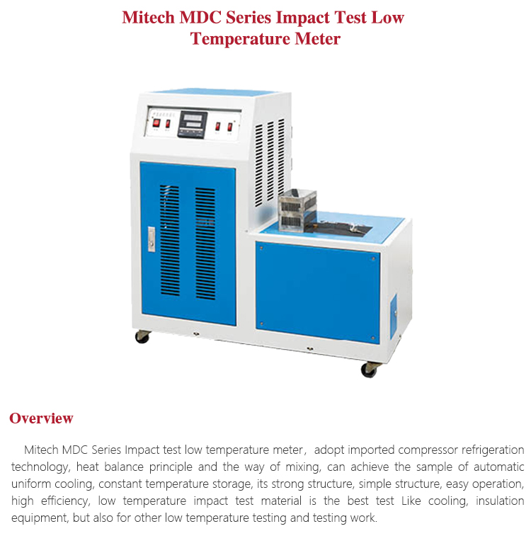 Mitech MDC Series Impact test low temperature meter,adopt imported compressor refrigeration technology, heat balance principle and the way of mixing, can achieve the sample of automatic uniform cooling, constant temperature storage, its strong structure, simple structure, easy operation, high efficiency, low temperature impact test material is the best test Like cooling, insulation equipment, but also for other low temperature testing and testing work.