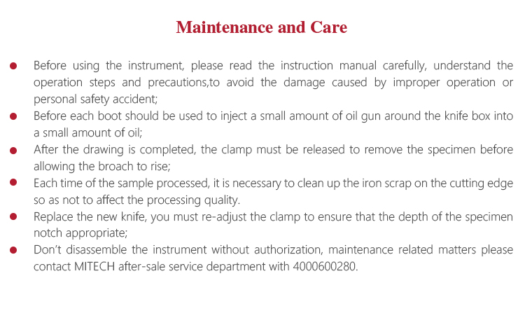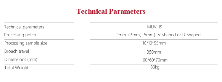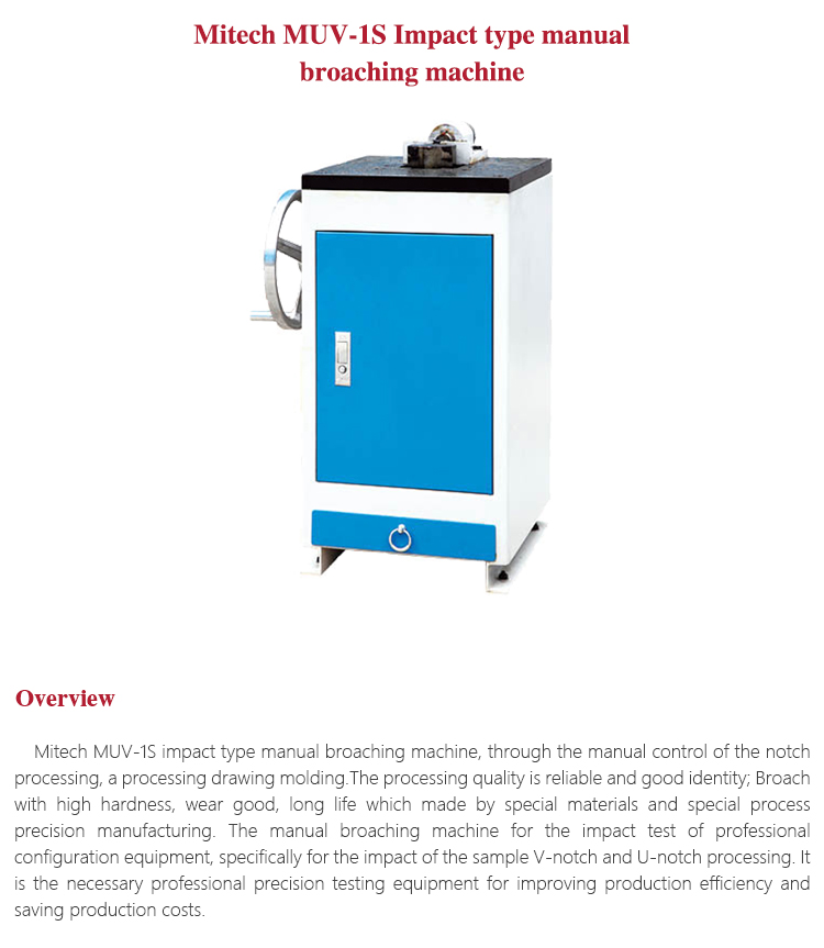 Product OverviewMitech MUV-1S impact type manual broaching machine, through the manual control of the notch processing, a processing drawing molding.The processing quality is reliable and good identity; Broach with high hardness, wear good, long life which made by special materials and special process precision manufacturing. The manual broaching machine for the impact test of professional configuration equipment, specifically for the impact of the sample V-notch and U-notch processing. It is the necessary professional precision testing equipment for improving production efficiency and saving production costs.