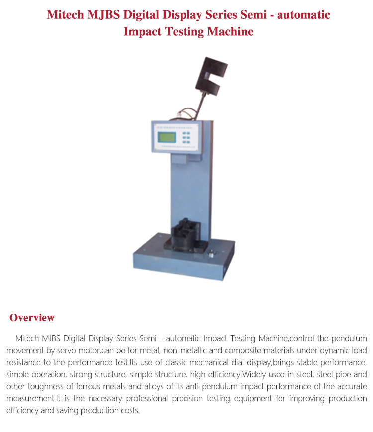 Mitech MJBS Digital Display Series Semi - automatic Impact Testing Machine,control the pendulum movement by servo motor,can be for metal, non-metallic and composite materials under dynamic load resistance to the performance test.Its use of classic mechanical dial display,brings stable performance, simple operation, strong structure, simple structure, high efficiency.Widely used in steel, steel pipe and other toughness of ferrous metals and alloys of its anti-pendulum impact performance of the accurate measurement.It is the necessary professional precision testing equipment for improving production efficiency and saving production costs.
