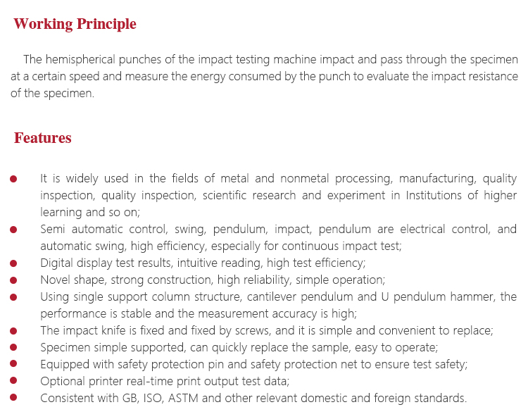 The hemispherical punches of the impact testing machine impact and pass through the specimen at a certain speed and measure the energy consumed by the punch to evaluate the impact resistance of the specimen.