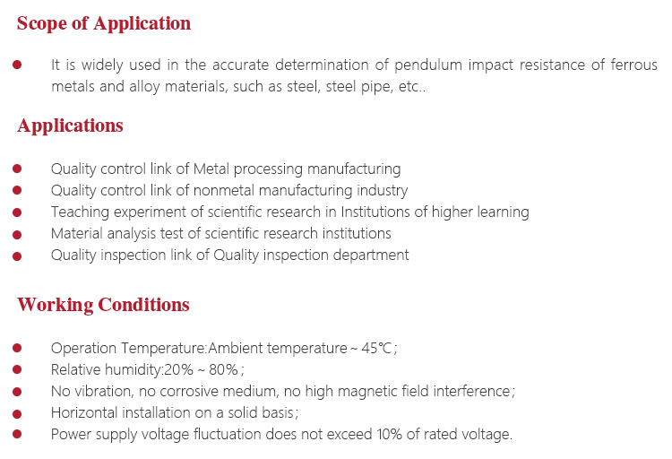 It is widely used in the accurate determination of pendulum impact resistance of ferrous metals and alloy materials, such as steel, steel pipe, etc..