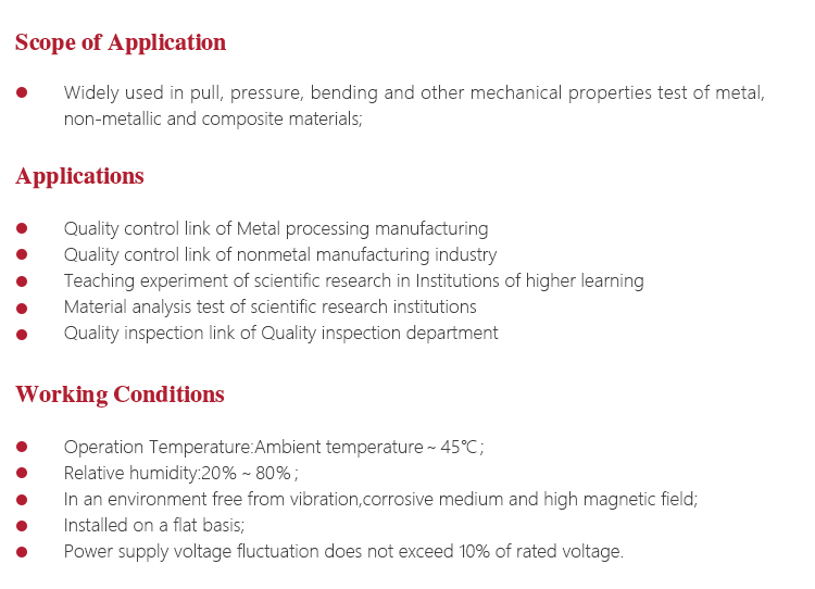 Product OverviewMitech MAW micro control series hydraulic universal testing machine , can conduct mechanical properties tests for metallic, non-metallic and composite materials including stretching, compression, bending, cutting, stripping, tearing and so on ,through controlling the high-pressure pump to drive the screw movement and equipped with the corresponding auxiliary. It uses manual and electro-hydraulic servo dual control mode, high-precision gap sealed cylinder, digital processing, closed-loop control technology, which has stable property, powerful function, accurate data processing, solid and simple structure, high reliability, simple performance, friendly interface. This product can be widely used in areas such as metallic and non-metallic processing industry, quality testing in quality inspection departments, scientific research in higher education institutions , which is a necessary professional precision testing equipment to improve production efficiency and save production costs.