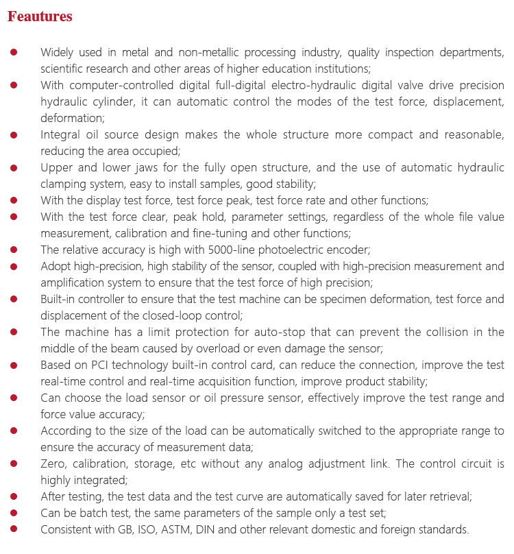 l With computer-controlled digital full-digital electro-hydraulic digital valve drive precision hydraulic cylinder, it can automatic control the modes of the test force, displacement, deformation.