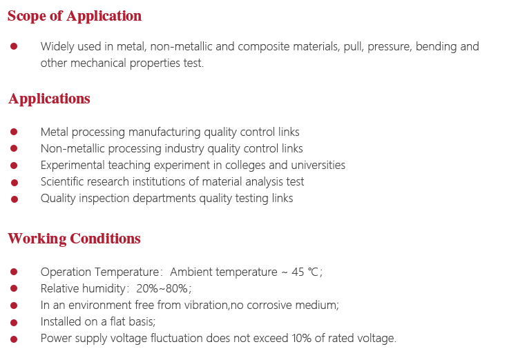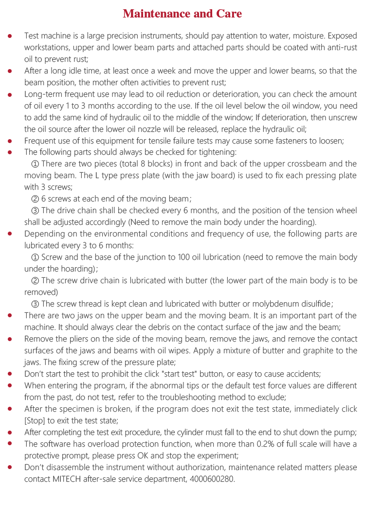 l Test machine is a large precision instruments, should pay attention to water, moisture. Exposed workstations, upper and lower beam parts and attached parts should be coated with anti-rust oil to prevent rust;