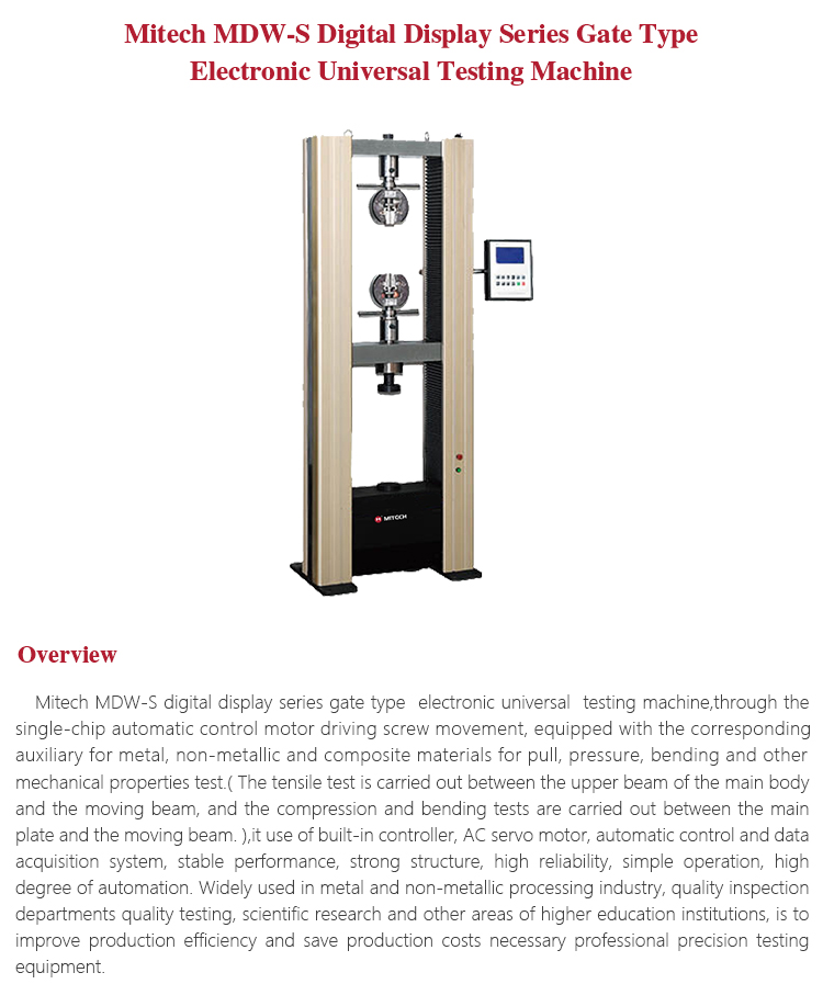 Mitech MDW-S digital display series gate type  electronic universal  testing machine,through the single-chip automatic control motor driving screw movement, equipped with the corresponding auxiliary for metal, non-metallic and composite materials for pull, pressure, bending and other mechanical properties test.( The tensile test is carried out between the upper beam of the main body and the moving beam, and the compression and bending tests are carried out between the main plate and the moving beam. ),it use of built-in controller, AC servo motor, automatic control and data acquisition system, stable performance, strong structure, high reliability, simple operation, high degree of automation. Widely used in metal and non-metallic processing industry, quality inspection departments quality testing, scientific research and other areas of higher education institutions, is to improve production efficiency and save production costs necessary professional precision testing equipment.