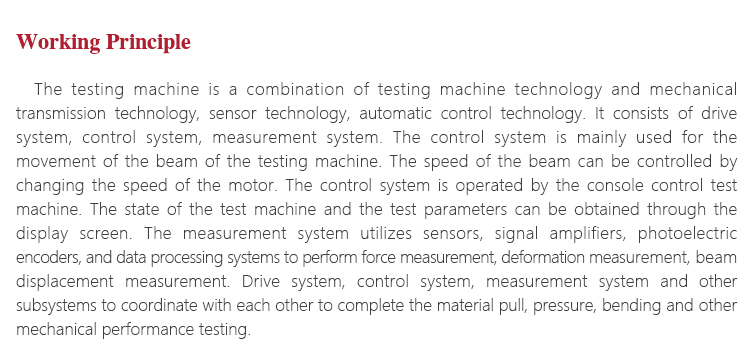 The testing machine is a combination of testing machine technology and mechanical transmission technology, sensor technology, automatic control technology. It consists of drive system, control system, measurement system. The control system is mainly used for the movement of the beam of the testing machine. The speed of the beam can be controlled by changing the speed of the motor. The control system is operated by the console control test machine. The state of the test machine and the test parameters can be obtained through the display screen. The measurement system utilizes sensors, signal amplifiers, photoelectric encoders, and data processing systems to perform force measurement, deformation measurement, beam displacement measurement. Drive system, control system, measurement system and other subsystems to coordinate with each other to complete the material pull, pressure, bending and other mechanical performance testing.