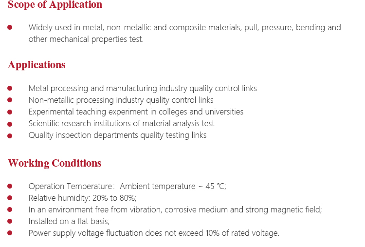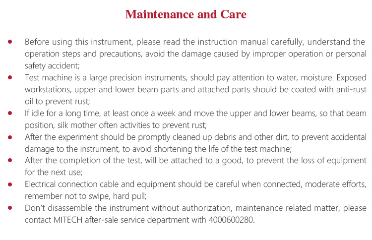 l Test machine is a large precision instruments, should pay attention to water, moisture. Exposed workstations, upper and lower beam parts and attached parts should be coated with anti-rust oil to prevent rust;