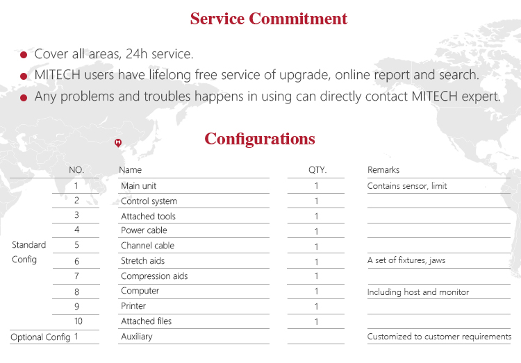 Mitech MDW micro control series single-arm electronic tensile testing machine, through the computer control motor drive screw, equipped with the corresponding auxiliary for metal, non-metallic and composite materials for pull, pressure, bending and other mechanical properties test (Tensile test carried out between the upper beam of the main body and the moving beam. Compression and bending tests carried out between the table of the host and the moving beam). It’s adopts the built-in controller, AC servo motor, by computer-aided means to achieve powerful function with stable performance, strong structure, high reliability, simple operation, high degree of automation. It’s widely used in metal and non-metallic processing industry, quality inspection departments, scientific research and other areas of higher education institutions and it’s a necessary professional precision testing equipment for improve production efficiency and save production costs.