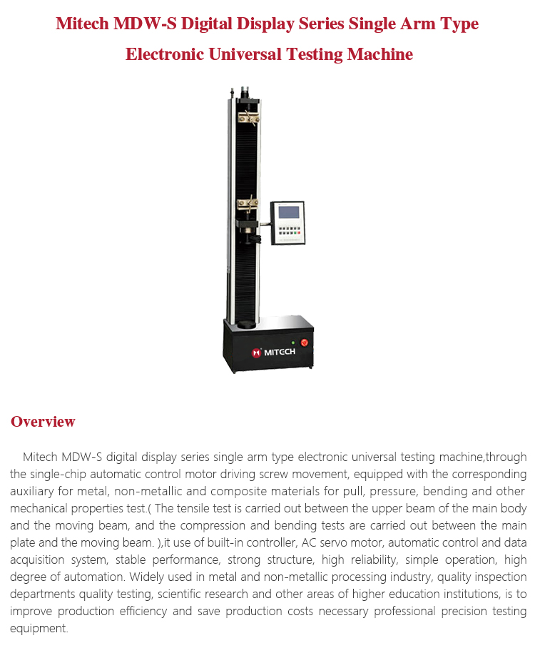 Mitech MDW-S digital display series single arm type electronic universal testing machine,through the single-chip automatic control motor driving screw movement, equipped with the corresponding auxiliary for metal, non-metallic and composite materials for pull, pressure, bending and other mechanical properties test.( The tensile test is carried out between the upper beam of the main body and the moving beam, and the compression and bending tests are carried out between the main plate and the moving beam. ),it use of built-in controller, AC servo motor, automatic control and data acquisition system, stable performance, strong structure, high reliability, simple operation, high degree of automation. Widely used in metal and non-metallic processing industry, quality inspection departments quality testing, scientific research and other areas of higher education institutions, is to improve production efficiency and save production costs necessary professional precision testing equipment.