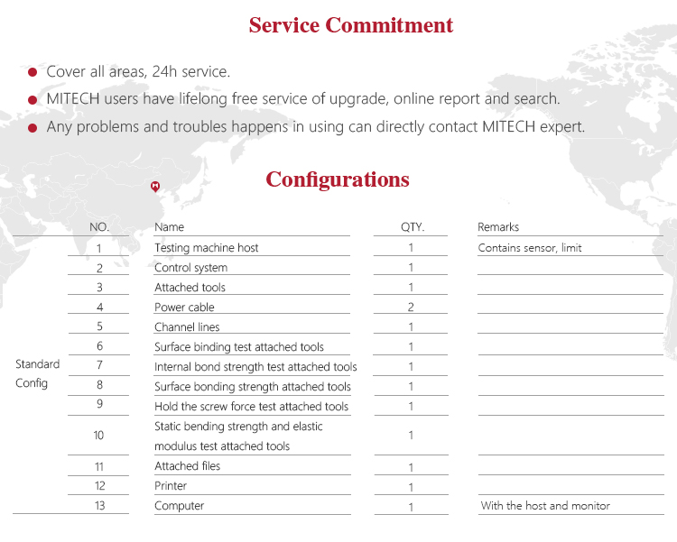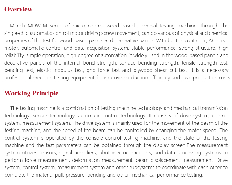 Mitech MDW-M series of micro control wood-based universal testing machine, through the single-chip automatic control motor driving screw movement, can do various of physical and chemical properties of the test for wood-based panels and decorative panels. With built-in controller, AC servo motor, automatic control and data acquisition system, stable performance, strong structure, high reliability, simple operation, high degree of automation, it widely used in the wood-based panels and decorative panels of the internal bond strength, surface bonding strength, tensile strength test, bending test, elastic modulus test, grip force test and plywood shear cut test. It is a necessary professional precision testing equipment for improve production efficiency and save production costs.