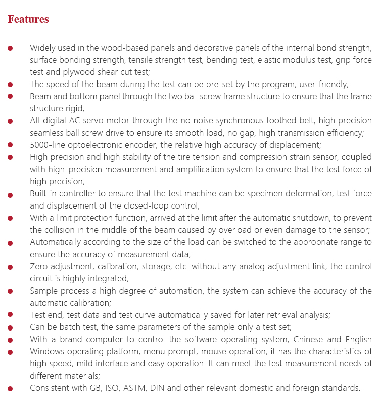 l Widely used in the wood-based panels and decorative panels of the internal bond strength, surface bonding strength, tensile strength test, bending test, elastic modulus test, grip force test and plywood shear cut test;
