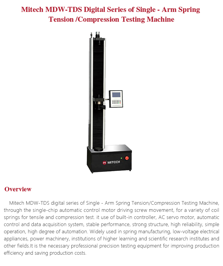 Mitech MDW-TDS digital series of Single - Arm Spring Tension/Compression Testing Machine, through the single-chip automatic control motor driving screw movement, for a variety of coil springs for tensile and compression test. it use of built-in controller, AC servo motor, automatic control and data acquisition system, stable performance, strong structure, high reliability, simple operation, high degree of automation. Widely used in spring manufacturing, low-voltage electrical appliances, power machinery, institutions of higher learning and scientific research institutes and other fields.It is the necessary professional precision testing equipment for improving production efficiency and saving production costs.