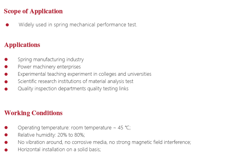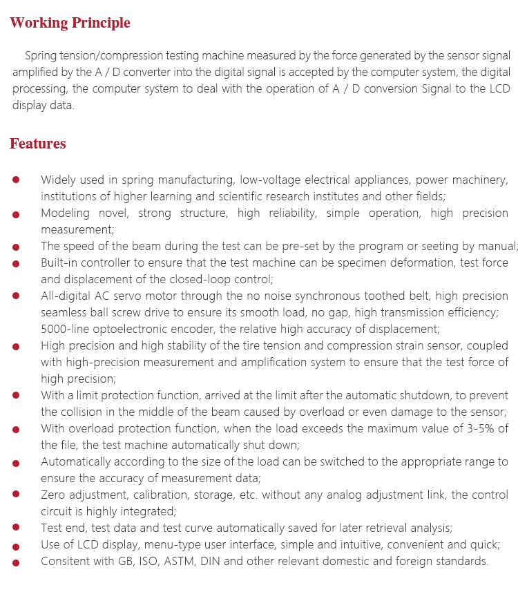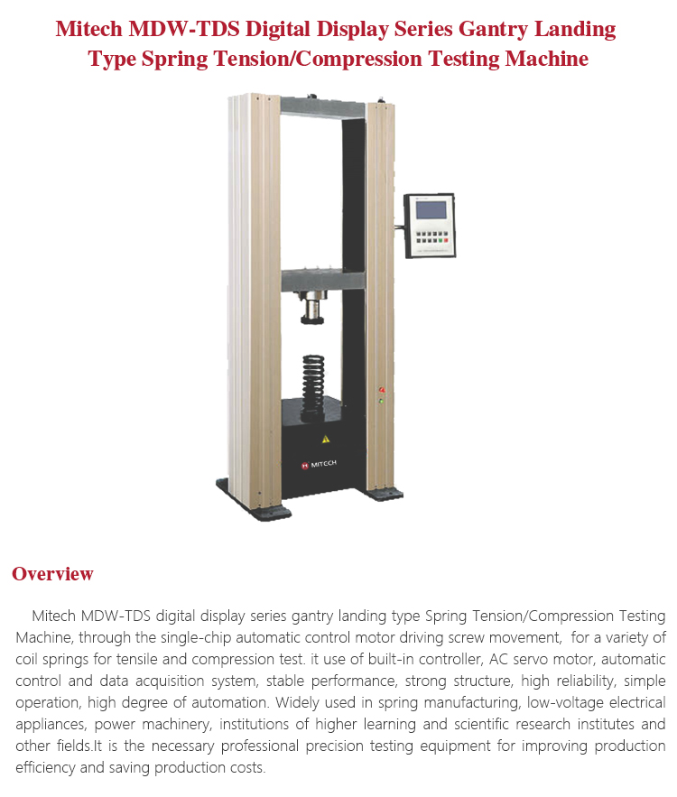 Mitech MDW-S digital display series gantry landing type Spring Tension/Compression Testing Machine, through the single-chip automatic control motor driving screw movement,  for a variety of coil springs for tensile and compression test. it use of built-in controller, AC servo motor, automatic control and data acquisition system, stable performance, strong structure, high reliability, simple operation, high degree of automation. Widely used in spring manufacturing, low-voltage electrical appliances, power machinery, institutions of higher learning and scientific research institutes and other fields.It is the necessary professional precision testing equipment for improving production efficiency and saving production costs.