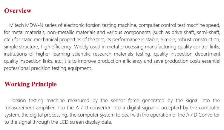 Mitech MDW-N series of electronic torsion testing machine, computer control test machine speed, for metal materials, non-metallic materials and various components (such as drive shaft, semi-shaft, etc.) for static mechanical properties of the test, its performance is stable, Simple, robust construction, simple structure, high efficiency. Widely used in metal processing manufacturing quality control links, institutions of higher learning scientific research materials testing, quality inspection department quality inspection links, etc.,it is to improve production efficiency and save production costs essential professional precision testing equipment.