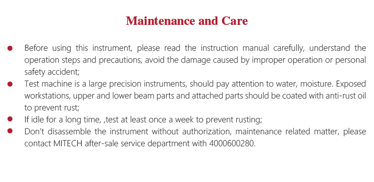 l Test machine is a large precision instruments, should pay attention to water, moisture. Exposed workstations, upper and lower beam parts and attached parts should be coated with anti-rust oil to prevent rust;