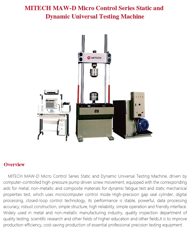 Product OverviewMITECH MAW-D Micro Control Series Static and Dynamic Universal Testing Machine, driven by computer-controlled high-pressure pump driven screw movement, equipped with the corresponding aids for metal, non-metallic and composite materials for dynamic fatigue test and static mechanical properties test, which uses microcomputer control mode High-precision gap seal cylinder, digital processing, closed-loop control technology, its performance is stable, powerful, data processing accuracy, robust construction, simple structure, high reliability, simple operation and friendly interface. Widely used in metal and non-metallic manufacturing industry, quality inspection department of quality testing, scientific research and other fields of higher education and other fields,it is to improve production efficiency, cost-saving production of essential professional precision testing equipment.