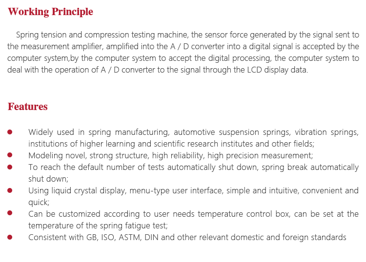 Spring tension and compression testing machine, the sensor force generated by the signal sent to the measurement amplifier, amplified into the A / D converter into a digital signal is accepted by the computer system,by the computer system to accept the digital processing, the computer system to deal with the operation of A / D converter to the signal through the LCD display data.
