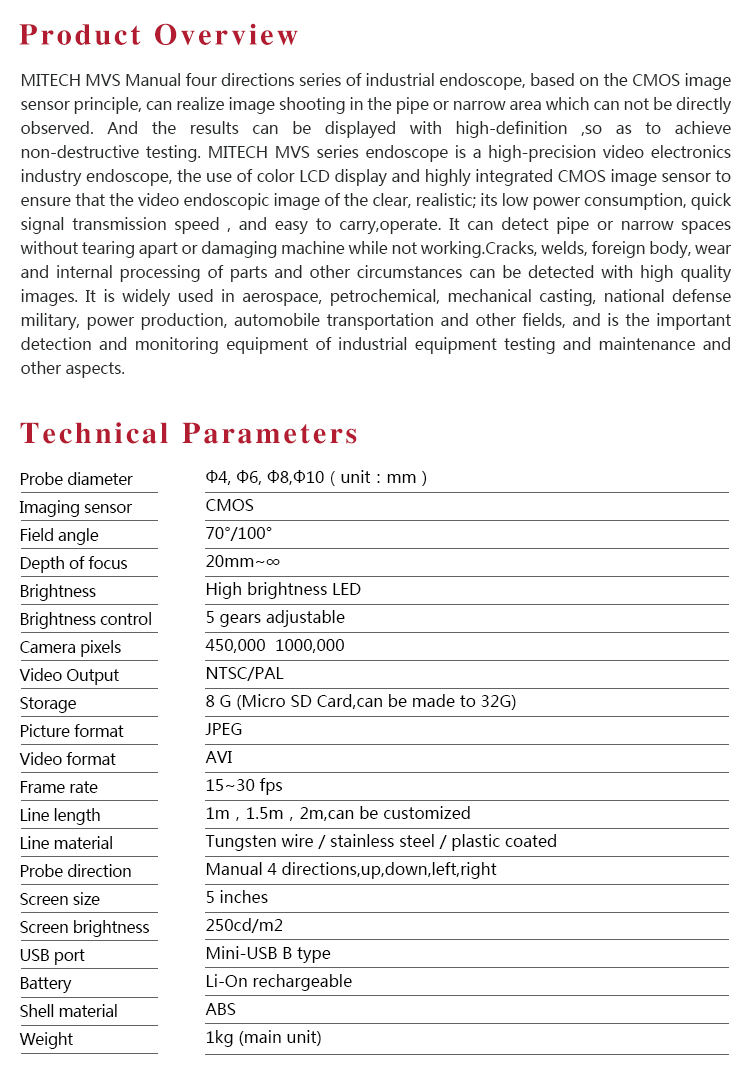 MITECH MVS Manual four directions series of industrial endoscope, based on the CMOS image sensor principle, can realize image shooting in the pipe or narrow area which can not be directly observed. And the results can be displayed with high-definition ,so as to achieve non-destructive testing. MITECH MVS series endoscope is a high-precision video electronics industry endoscope, the use of color LCD display and highly integrated CMOS image sensor to ensure that the video endoscopic image of the clear, realistic; its low power consumption, quick signal transmission speed , and easy to carry,operate. It can detect pipe or narrow spaces without tearing apart or damaging machine while not working.Cracks, welds, foreign body, wear and internal processing of parts and other circumstances can be detected with high quality images. It is widely used in aerospace, petrochemical, mechanical casting, national defense military, power production, automobile transportation and other fields, and is the important detection and monitoring equipment of industrial equipment testing and maintenance and other aspects.