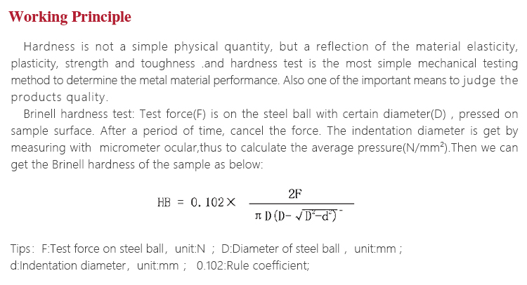 Brinell hardness test: Test force(F) is on the steel ball with certain diameter(D) , pressed on sample surface. After a period of time, cancel the force. The indentation diameter is get by measuring with  micrometer ocular,thus to calculate the average pressure(N/mm2).