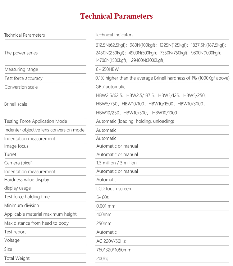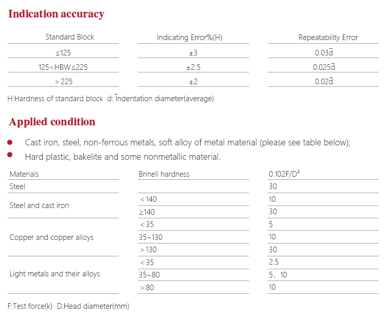 Brinell scale HBW2.5/62.5、HBW2.5/187.5、HBW5/125、HBW5/250、 HBW5/750、HBW10/100、HBW10/1500、HBW10/3000、 HBW10/250、HBW1