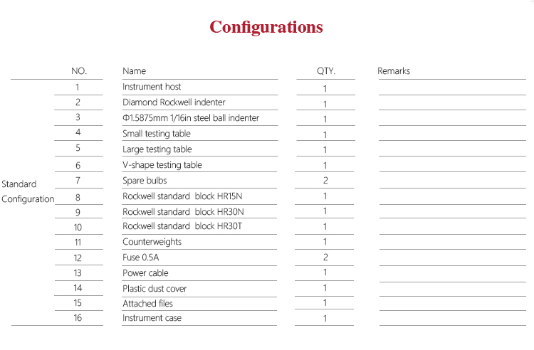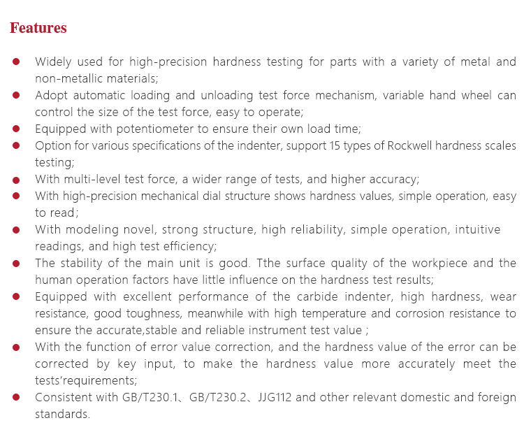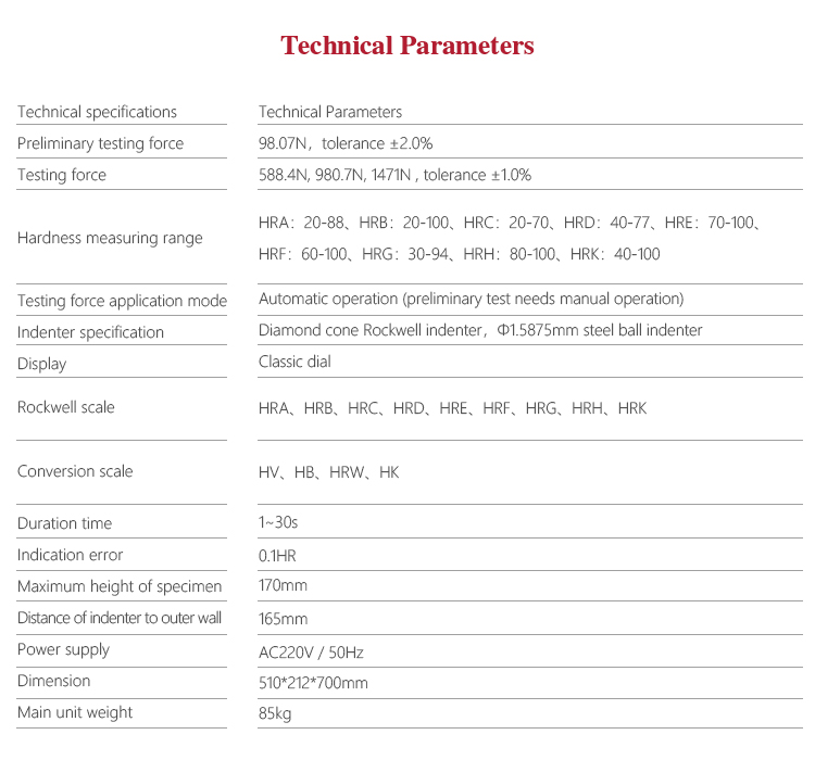 Hardness measuring range HRA:20-88、HRB:20-100、HRC:20-70、HRD:40-77、 HRE:70-100、HRF:60-100、HRG:30-94、HRH:80-100、 HRK:40-100