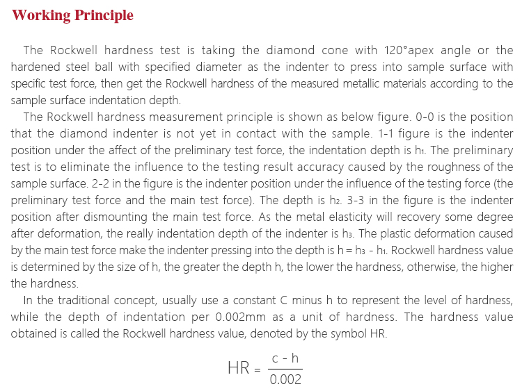 Working PrincipleThe Rockwell hardness test is taking the diamond cone with 120°apex angle or the hardened steel ball with specified diameter as the indenter to press into sample surface with specific test force, then get the Rockwell hardness of the measured metallic materials according to the sample surface indentation depth.