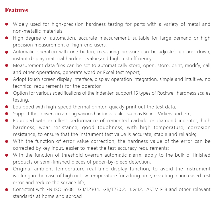 l Consistent with EN-ISO-6508、GB/T230.1GB/T230.2、JJG112ASTM E18 and other relevant standards at home and