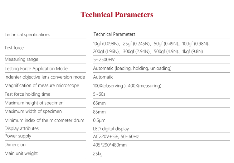 Instrument FeaturesWidely used in micro-specimen, thin specimen, surface coating, heat treatment of workpiece surface samples and etc.Vickers hardness test to meet different demands of scientific research institutions, precision machining and quality inspection departments and other materials research;