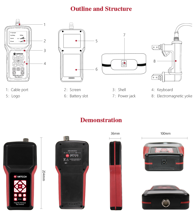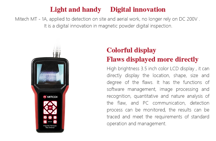 l The brightness, power, lighting form of Mitech portable magnetic flaw detector series are adjustable, to meet the needs of different testing environment.