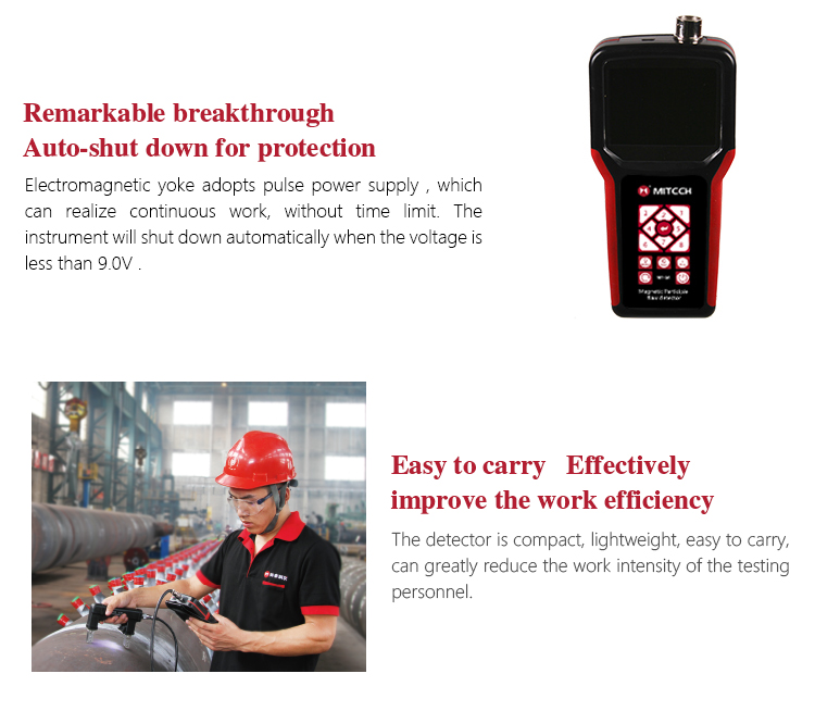 MITECH magnetic detectors pockets and belts, portable compact, the operator can tilt the instrument across the waist, greatly reducing the labor intensity of the flaws, improve work efficiency, especially for the field, high altitude testing and other special occasions flaw detection.