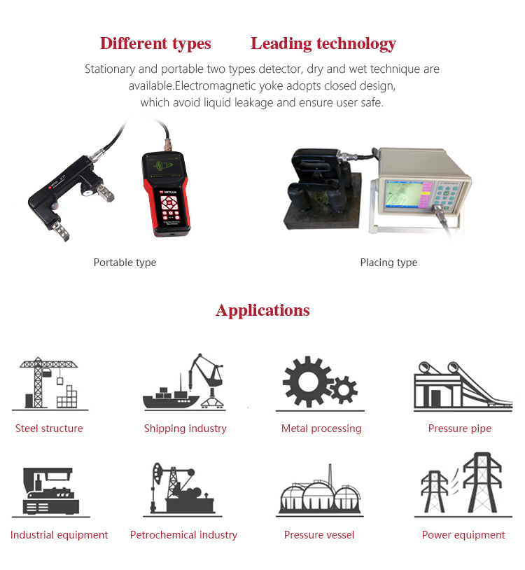 It is widely used in the industry of aircraft manufacturing, boiler and pressure vessel, electric, oil field, shipbuilding, turbine and combustion engine parts, mine, machinery, standard parts, oil pump, vehicle parts, bridging, chemical, railway, large mechanical components, steel structure equipment etc. It mainly detects the surface detection of forging, quenching, welding, fatigue, for example, irregular workpiece of chain, crankshaft, bearing, high strength bolt, spring, forging, petrochemical pipe, valve, vane, gear, anchor chain, welding seam etc.