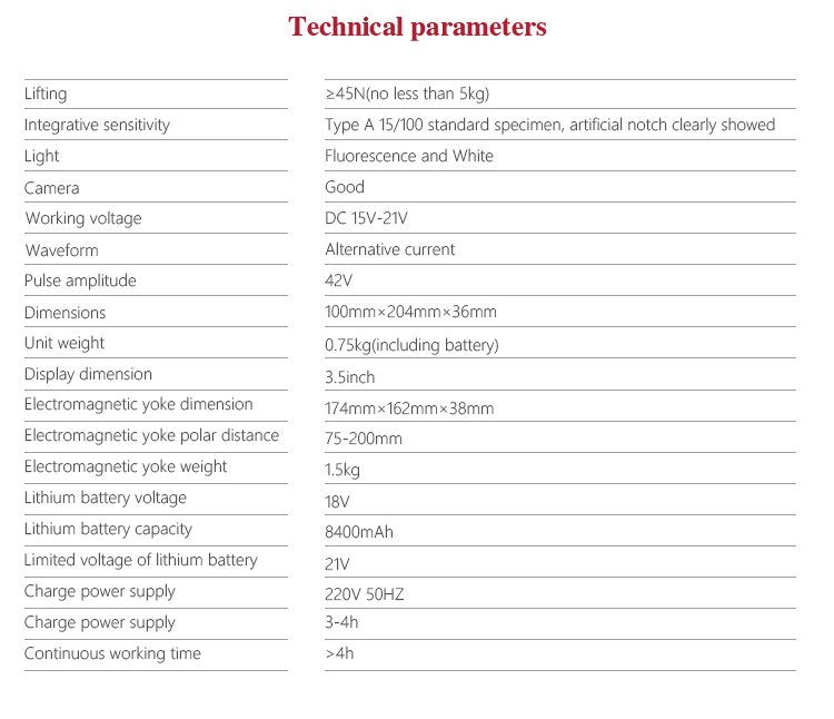 l The large capacity lithium battery makes it portable, solves the drawbacks of traditional, magnetic particle detector relying on the 220V power supply, with low power consumption, small size, battery can be charged when the detector is on and off. It is especially suitable for testing in field or high altitude;