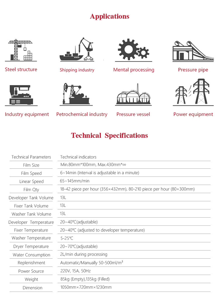 Product OverviewMFP430-A fully automatic film professor is the new generation product in Mitech Co.,Ltd, with super digital display board and the microcomputer control system. Specially designed stop sink greatly improves the fixing liquid effect, especially suitable for a large number of film processing. The processes are developing , stop sink washing , fixing , small washing, washing and drying. Infrared sensor control system, countdown function when feeding in, ensures safefilm sending. Built-in infrared auxiliary operation, transfers film more accurately. Dupont materials of high strength type roller groups, transfers various size film. The countdown monitoring function can finish the circulation in one minute and enter the standby mode automatically,make the film process fluently. Timing operation can reduce the roller surface crystallization, effectively activate circulation system. Sink capacity is greater, to meet the needs of a larger number of film rinse. Gap bridge direction can be adjusted to avoid film stuck. Processing liquid can automatically cycle and replenish to keep the liquid fresh. Professional prototype drying duct system makes the both sides of the film with no water print. It’s widely used for various pipelines and pressure vessels in the fields of petroleum, chemical, metallurgy, shipbuilding, aviation, aerospace and etc.