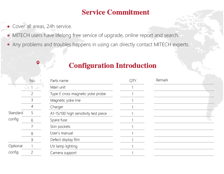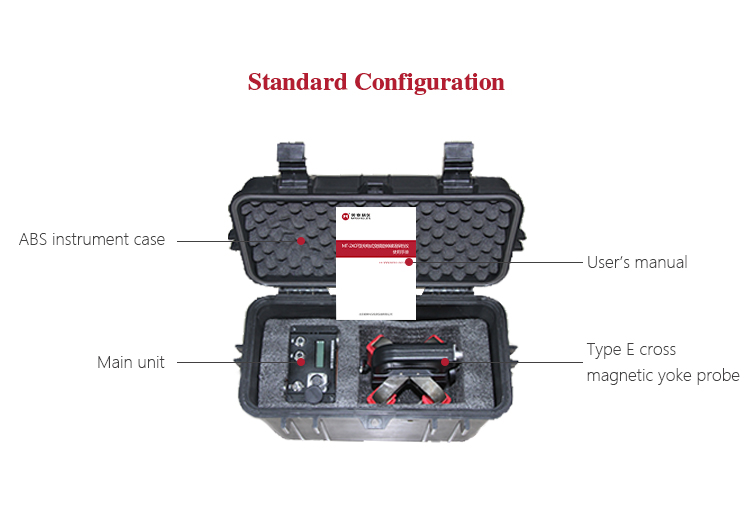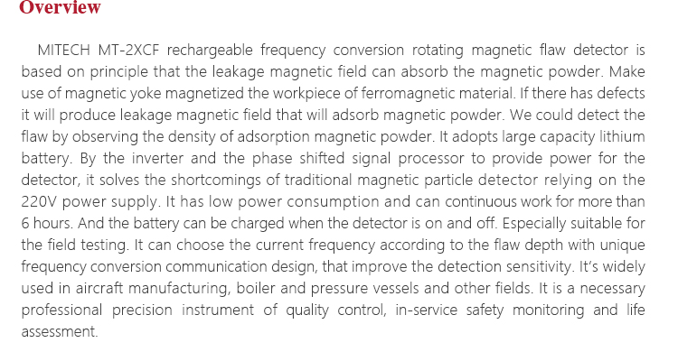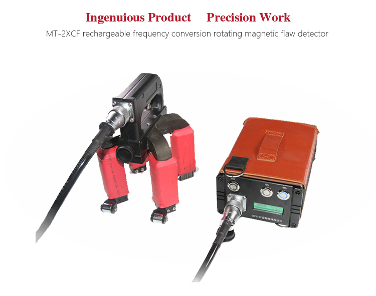 MITECH MT-2XCF rechargeable frequency conversion rotating magnetic flaw detector is based on principle that the leakage magnetic field can absorb the magnetic powder. Make use of magnetic yoke magnetized the workpiece of ferromagnetic material. If there has defects it will produce leakage magnetic field that will adsorb magnetic powder. We could detect the flaw by observing the density of adsorption magnetic powder. It adopts large capacity lithium battery. By the inverter and the phase shifted signal processor to provide power for the detector, it solves the shortcomings of traditional magnetic particle detector relying on the 220V power supply. It has low power consumption and can continuous work for more than 6 hours. And the battery can be charged when the detector is on and off. Especially suitable for the field testing. It can choose the current frequency according to the flaw depth with unique frequency conversion communication design, that improve the detection sensitivity. Its widely used in aircraft manufacturing, boiler and pressure vessels and other fields. It is a necessary professional precision instrument of quality control, in-service safety monitoring and life assessment.