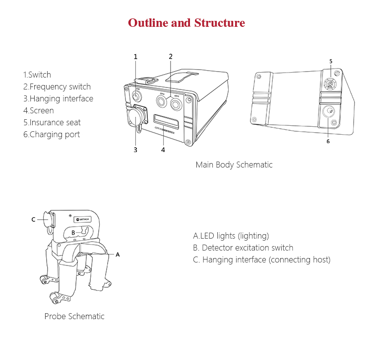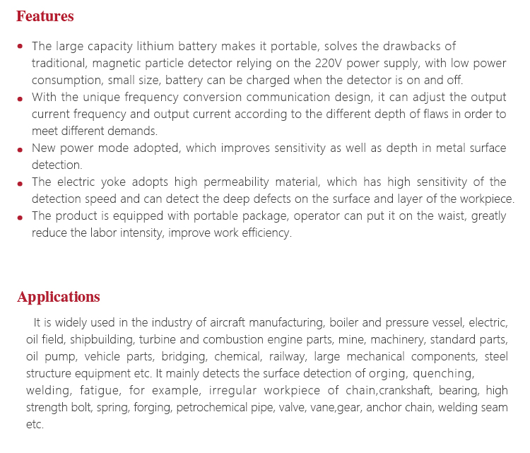 l The large capacity lithium battery makes it portable, solves the drawbacks of traditional, magnetic particle detector relying on the 220V power supply, with low power consumption, small size, battery can be charged when the detector is on and off.
