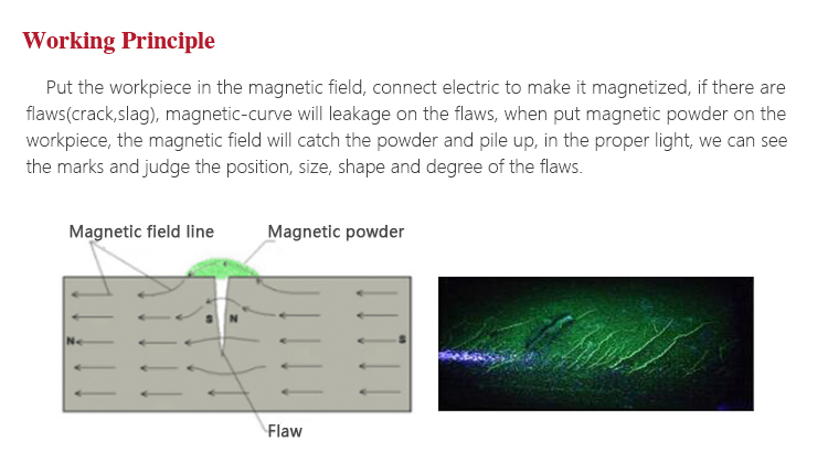 Put the workpiece in the magnetic field, connect electric to make it magnetized, if there are flaws(crack,slag), magnetic-curve will leakage on the flaws, when put magnetic powder on the workpiece, the magnetic field will catch the powder and pile up, in the proper light, we can see the marks and judge the position, size, shape and degree of the flaws.