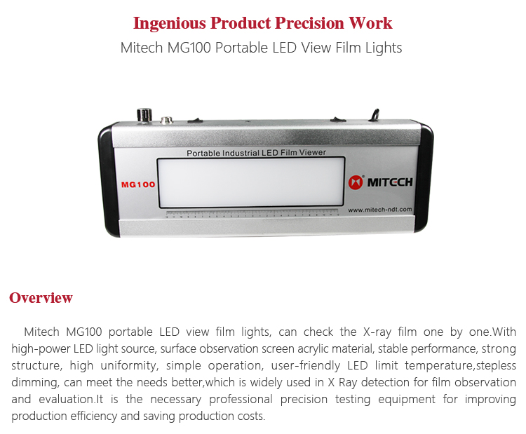 Product OverviewMitech MG100 portable LED view film lights,can check the X-ray film one by one.With high-power LED light source, surface observation screen acrylic material, stable performance, strong structure, high uniformity, simple operation, user-friendly LED limit temperature, stepless dimming, can meet the needs better,which is widely used in X Ray detection for film observation and evaluation.It is the necessary professional precision testing equipment for improving production efficiency and saving production costs