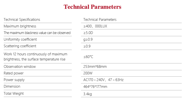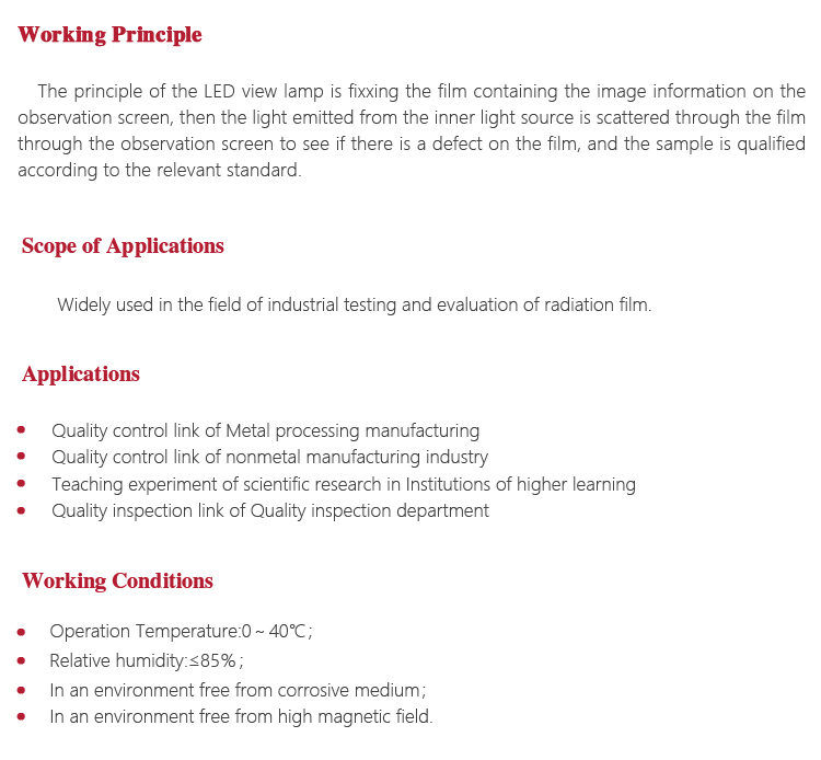 Working PrincipleThe principle of the LED view lamp is fixxing the film containing the image information on the observation screen, then the light emitted from the inner light source is scattered through the film through the observation screen to see if there is a defect on the film, and the sample is qualified according to the relevant standard
