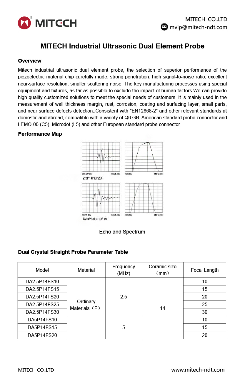 Mitech industrial ultrasonic dual element probe, the selection of superior performance of the piezoelectric material chip carefully made, strong penetration, high signal-to-noise ratio, excellent near-surface resolution, smaller scattering noise. The key manufacturing processes using special equipment and fixtures, as far as possible to exclude the impact of human factors.We can provide high-quality customized solutions to meet the special needs of customers. It is mainly used in the measurement of wall thickness margin, rust, corrosion, coating and surfacing layer, small parts, and near surface defects detection..Consistent with "EN12668-2" and other relevant standards at domestic and abroad, compatible with a variety of Q6 GB, American standard probe connector and LEMO-00 (C5), Microdot (L5) and other European standard probe connector.
