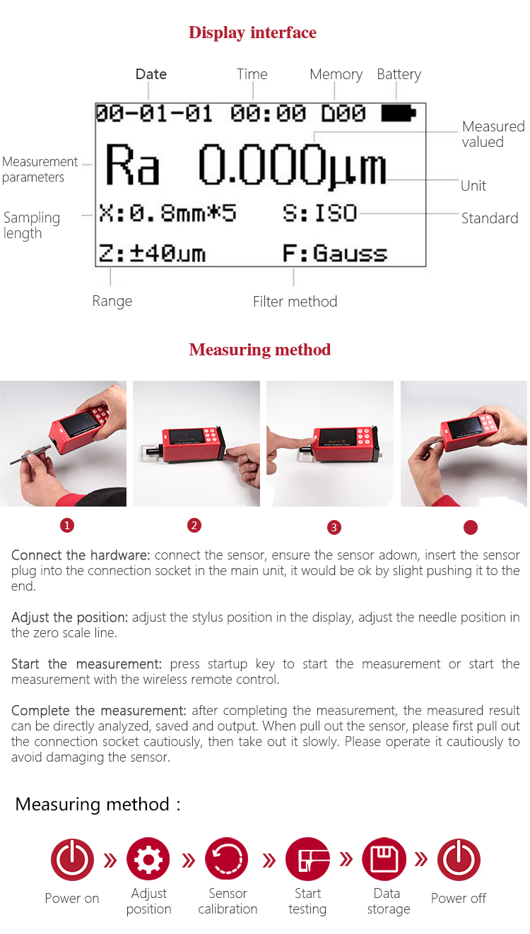 The MR200 surface roughness tester is a new upgrade instrument which adopts the newest processor. This instrument adopts 2.7 inch OLED display, combines accurate measurement, exquisite design, fast process rate and complete protection in one host. It is highly favored by users since it was produced, it has large measurement range, superior than other similar products and can meet different needs of users. By connecting with Micro-USB port, Bluetooth, SD card, it can do wireless remote control, measurement, print and communicate with PC and store massive data. It has been widely used in the quality control process of various precision metals, plays an important and necessary role in rising production qualification rate and saving cost.