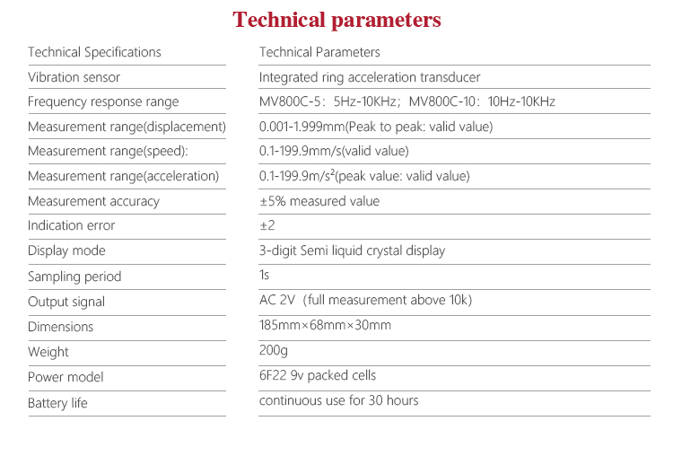 MITECH portable vibration meter MV800C is made up of piezoelectric transducer and digital display circuit. It is mainly used to measure vibration acceleration, speed and displacement of various rotary machine. This product has the advantages of large measurement, wide variety, intuitively demonstration, small size, light weight etc. It is widely used in measurement on site or at height and can reduce the working strength, improve the working efficiency.