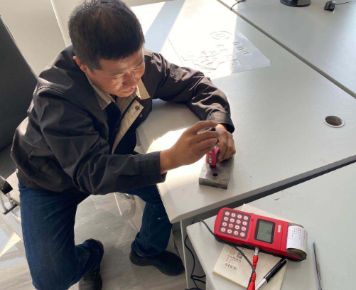 隨后美泰工程師隨李工來(lái)到工廠(chǎng)對(duì)現(xiàn)場(chǎng)工件做硬度及缺陷檢測(cè),在現(xiàn)場(chǎng)美泰工程師使用里氏硬度計(jì)MH500對(duì)現(xiàn)場(chǎng)工件進(jìn)行了硬度測(cè)試,最終顯示數(shù)值也十分穩(wěn)定,并且MH500里氏硬度計(jì)支持現(xiàn)場(chǎng)打印測(cè)量結(jié)果更便于數(shù)據(jù)留存記錄。