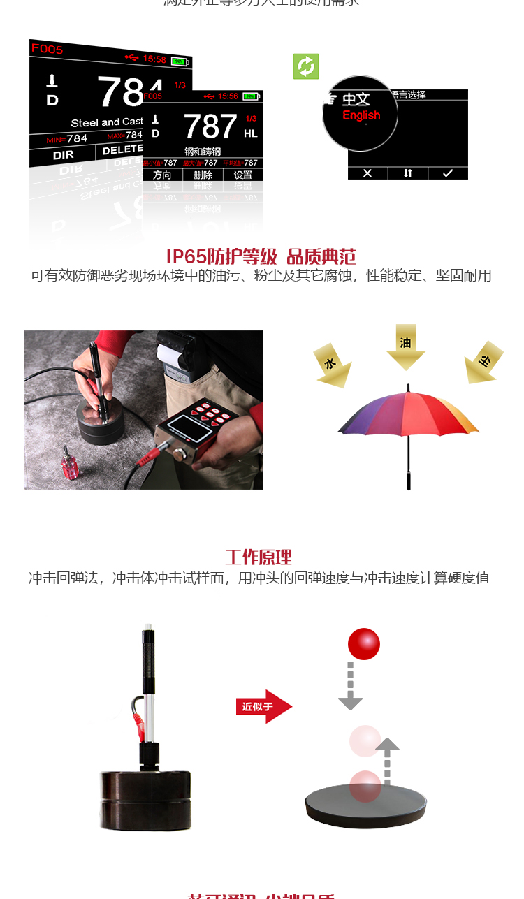 | 硬度制式 | ?里氏(HL)、布氏(HB)、洛氏B(HRB)、洛氏C(HRC)、洛氏A(HRA)、維氏(HV)、肖氏(HS); |