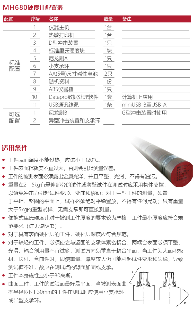 曲面工件:工件的試驗(yàn)面最好是平面。當(dāng)被測(cè)表面曲率半徑R小于30mm的工件在測(cè)試時(shí)應(yīng)使用小支承環(huán)或異型支承環(huán);