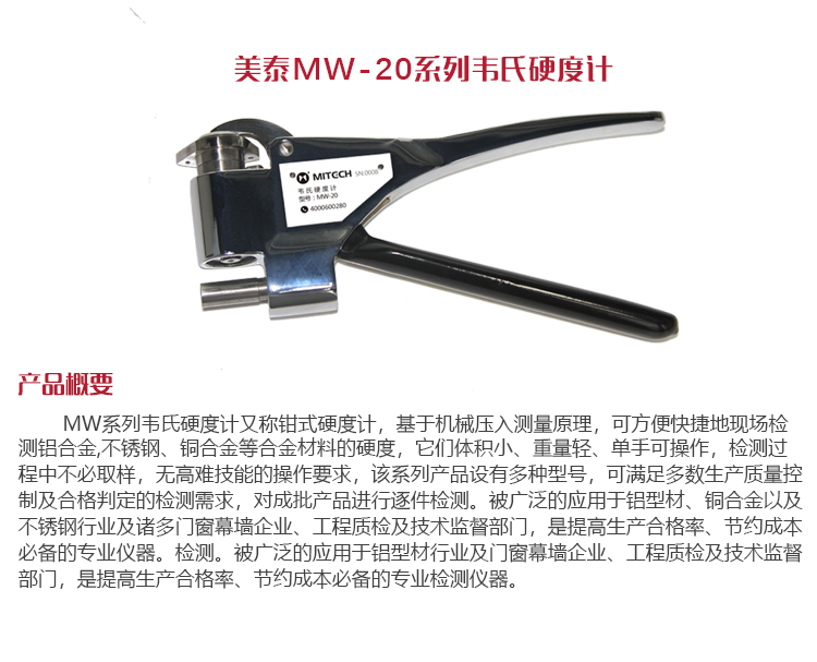 產(chǎn)品概述MW-20系列鋁合金系列韋氏硬度計(jì)又稱鉗式硬度計(jì),基于機(jī)械壓入測(cè)量原理,可方便快捷地現(xiàn)場(chǎng)檢測(cè)鋁合金材料的硬度。它們體積小、重量輕、單手可操作,檢測(cè)過(guò)程中不必取樣,無(wú)高難技能的操作要求。該系列產(chǎn)品設(shè)有多種型號(hào),可滿足多數(shù)生產(chǎn)質(zhì)量控制及合格判定的檢測(cè)需求,對(duì)成批產(chǎn)品進(jìn)行逐件檢測(cè)。被廣泛的應(yīng)用于鋁型材行業(yè)及諸多門(mén)窗幕墻企業(yè)、工程質(zhì)檢及技術(shù)監(jiān)督部門(mén),是提高生產(chǎn)合格率、節(jié)約成本必備的專業(yè)儀器。
