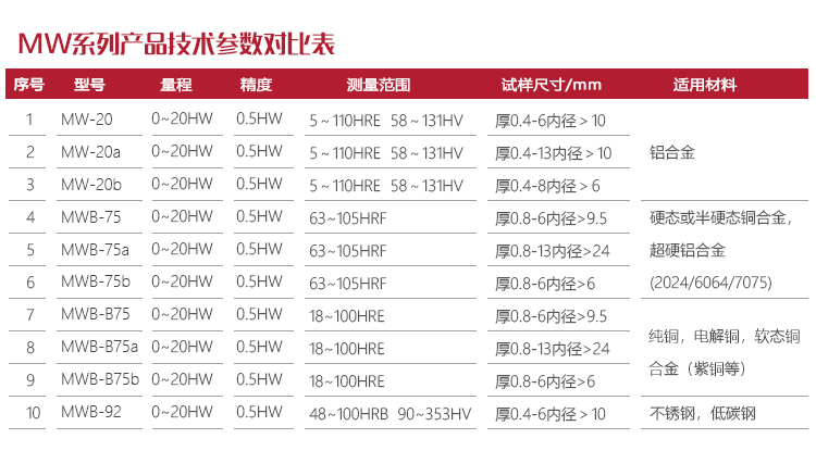 操作方法及注意事項(xiàng)MW-20系列鋁合金韋氏硬度計(jì)設(shè)有MW-20、MW-20a、MW-20b三種型號(hào)。MW-20型為通用型,用于測(cè)量厚度在0.8-6.0mm材料;MW-20a型為厚材專用型,用于測(cè)量厚度在6.0-13mm的材料;MW-20b型為細(xì)管材專用型,用于測(cè)量?jī)?nèi)徑為6.0mm以上的管材。三種型號(hào)的儀器均可用于測(cè)量管材、板材和型材。