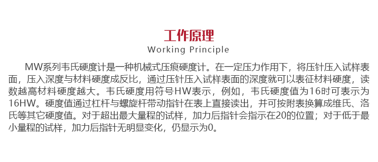 工作原理MW-20系列鋁合金系列韋氏硬度計(jì)是一種機(jī)械式壓痕硬度計(jì)。在一定壓力作用下,將壓針壓入試樣表面,壓針壓入試樣表面的深度與材料硬度成反比,通過(guò)杠桿與螺旋桿帶動(dòng)指針將壓入深度轉(zhuǎn)換為材料硬度值并在表盤(pán)上顯示出測(cè)量結(jié)果。韋氏硬度用符號(hào)HW表示,例如,韋氏硬度值為16時(shí)可表示為16HW。測(cè)得的韋氏硬度值可依據(jù)附表?yè)Q算成維氏、洛氏等其它硬度值。對(duì)于超出最大量程的試樣,加力后指針會(huì)指示在表盤(pán)滿刻度值20的位置;對(duì)于低于最小量程的試樣,加力后指針無(wú)明顯變化,仍顯示為0。